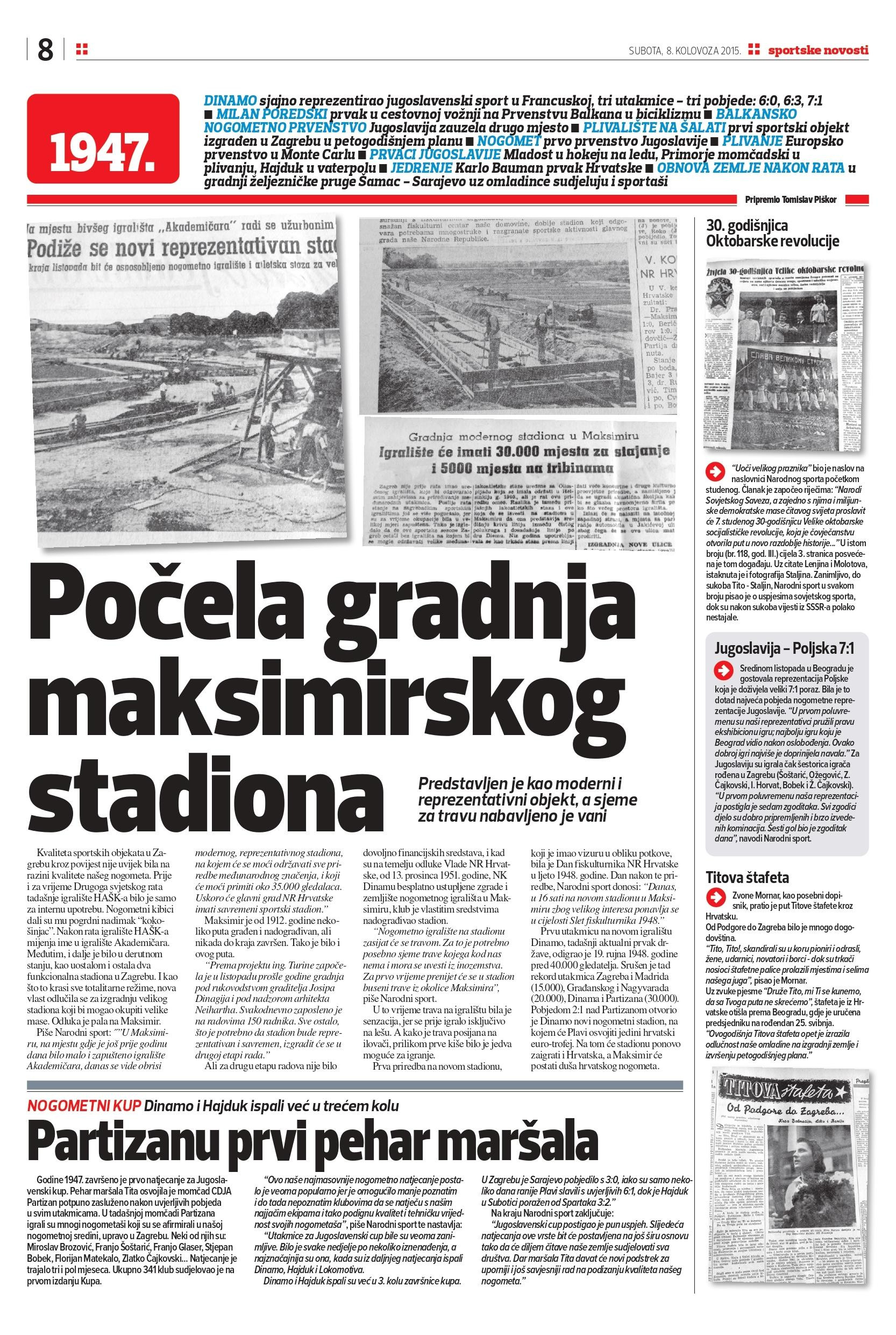 Piše Narodni sport: ˝”U Maksimiru, na mjestu gdje je još prije godinu dana bilo malo i zapušteno igralište Akademičara, danas se vide obrisi modernog, reprezentativnog stadiona, na kojem će se moći održavati sve priredbe međunarodnog značenja, i koji će moći primiti oko 35.000 gledalaca. Uskoro će glavni grad NR Hrvatske imati savremeni sportski stadion.”