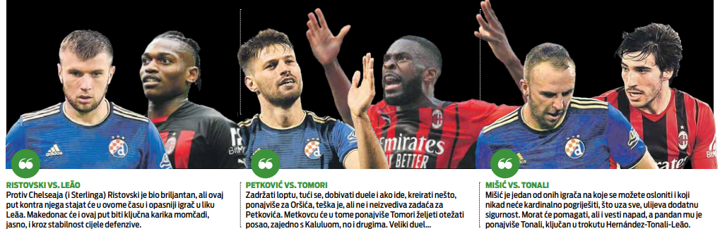 Neće se cijelo vrijeme direktno sudarati, ovo je duel igrača s prilično jasnim ulogama u momčadi, koji iz pozadine ruše suparničke napade, ali ih ujedno i grade suptilnim i kreativnim loptama prema naprijed. Mišić je već dugo najkonzistentniji igrač plavoga kadra, a u sudaru s Chelseajem pokazao je koliko je inteligentan i čvrst, racionalan i bitan u držanju taktičkog okvira. Tonali nadire, ne kao mlada nada (22 godine), već sada kao etablirana zvijezda i jedan od glavnih igrača milanske momčadi; čovjek čije predstave dižu vrijednost cijele momčadi unutar utakmice. Upravo i njegov "heat-map" otkriva te svojevrsne opasne trokute koje gradi s Hernandezom i Leãom. Josip Mišić, pak, nema amplitude, stoga se može očekivati da će svoj dio posla obaviti, iako će naletjeti na mnogo agresivniju momčad od Chelseaja. Ako izdrži i ujednači igru, Dinamo će biti na štihu.