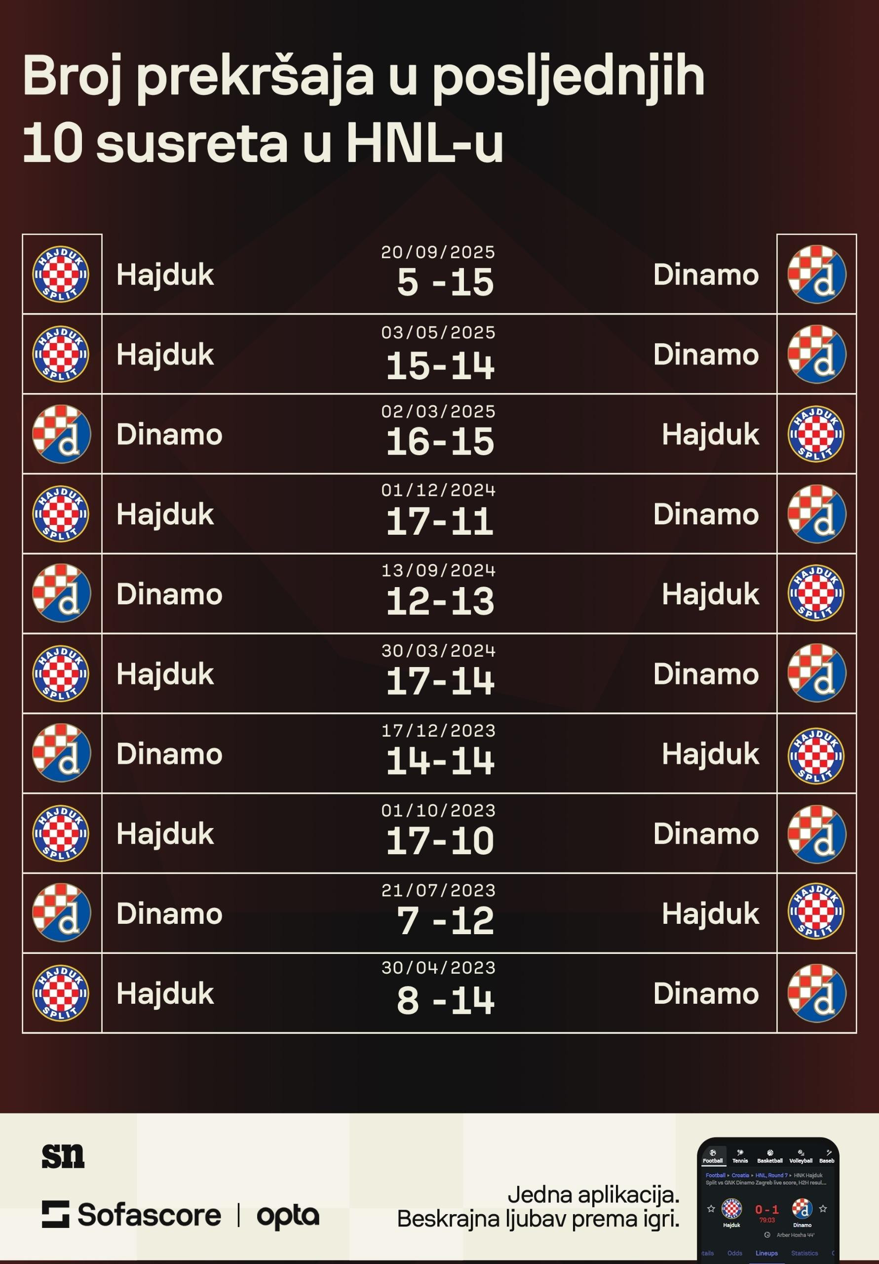 A kad smo već kod prekršaja i čvrstine, samo još dvije od preostalih 9 utakmica završene su s manje od 10 prekršaja na kontu jedne ekipe. Prvi put se to dogodilo Hajduku 30. travnja 2023. godine, ali su tada ekipe podijelile bodove, a tri mjeseca kasnije, u prvom kolu tadašnje sezone je istu grešku ponovio Dinamo koji je napravio tek 7 prekršaja u 90 minuta i to mu se odbilo od glavu porazom od 1:2, odnosno Hajdukovim preokretom.