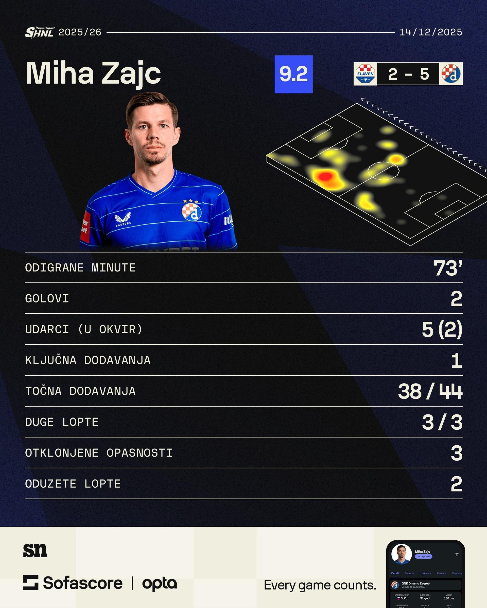 Osim dva zabijena zgoditka, Zajc je briljirao i u drugim poljima nogometne igre, podijelio je 38 dodavanja (86 % točnost), tri duge lopte, imao jedan uspješan dribling, a posebno efikasan bio je u obrambenom dijelu; s dva uspješna klizeća starta, jednom presječenom loptm, tri otklonjene opasnosti, pet osvojenih posjeda i tri duela u kojima je izašao kao pobjednik. Za svoju izvedbu, aplikacija Sofascore dodijelila mu je ocjenu 9.3, uvjerljivo najveću među svim pojedincima na susretu.