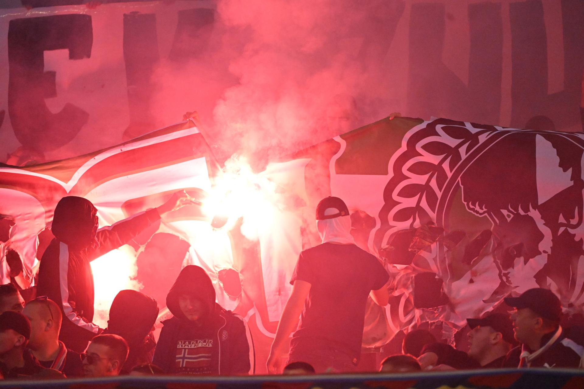 Uz zbivanja na travnjaku, živo je bilo i na tribinama Poljuda. Najvatreniji Hajdukovi navijači iskoristili su priliku za dodatno “pokazivanje snage", a pohvalili su se novim navijačkim trofejem, zaplijenjenom zastavom. Na sjevernoj tribini osvanuo je jedan od prepoznatljivih transparenata Green Dragonsa, navijačke skupine ljubljanske Olimpije. Uz paljenje zastave, Torcida je dodatno začinila atmosferu stihovima: "Tražim je na karti nema je, Slovenije."