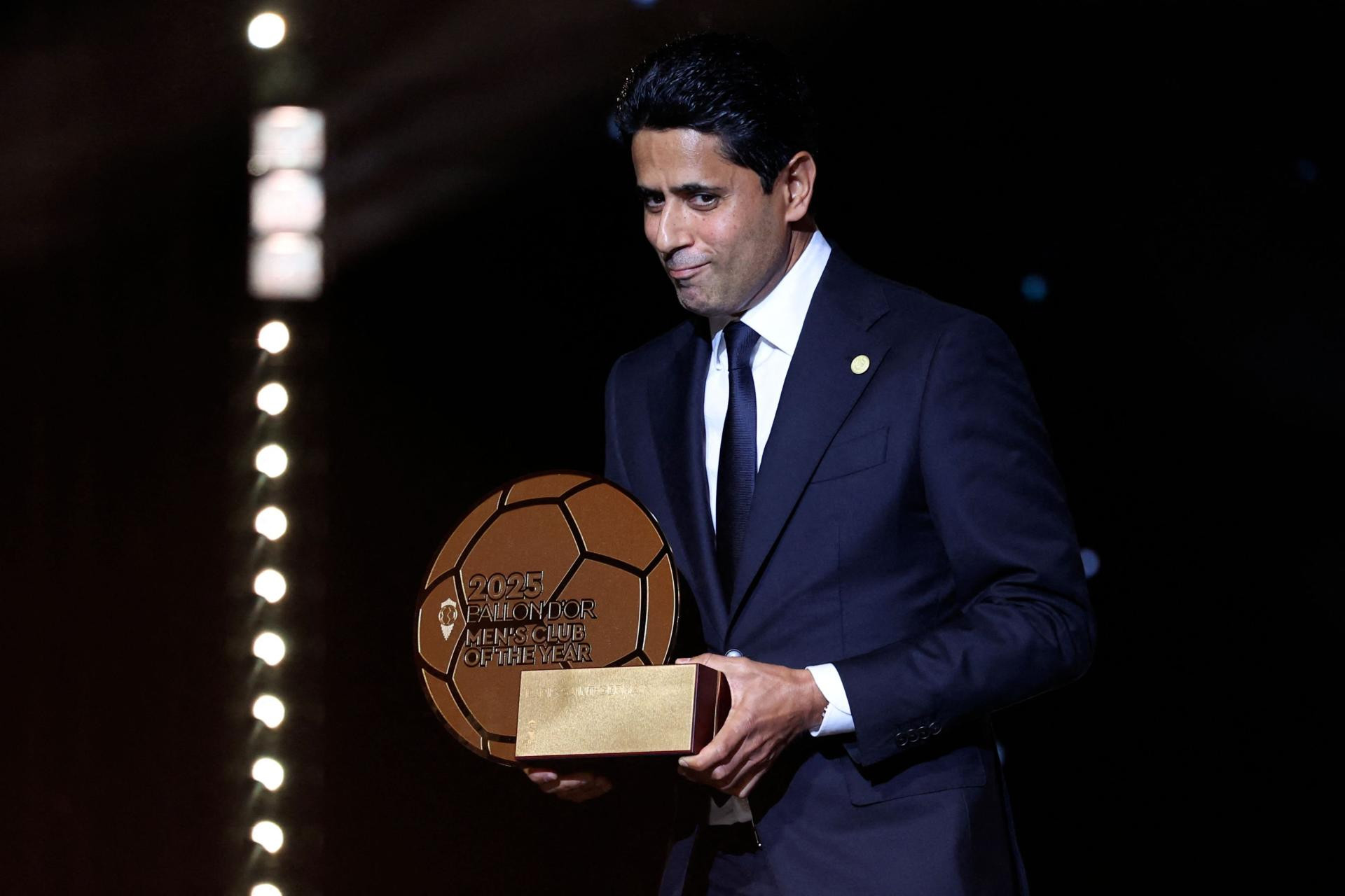 Predsjednik Nasser al-Khelaïfi izašao je na pozornicu odmah nakon poraza svog kluba od Marseillea 0-1 kako bi primio nagradu.