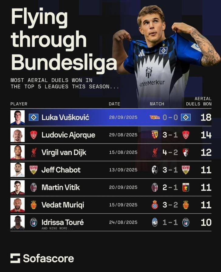Luka Vušković, mladi hrvatski stoper koji trenutačno brani boje HSV-a kao posuđeni igrač Tottenhama, upisao je povijesni učinak u najjačim europskim ligama. U susretu protiv Herthe, Vušković je osvojio čak 18 zračnih duela, čime je postao prvi igrač u posljednjih pet sezona ‘liga petice‘ koji je to uspio u jednoj utakmici.