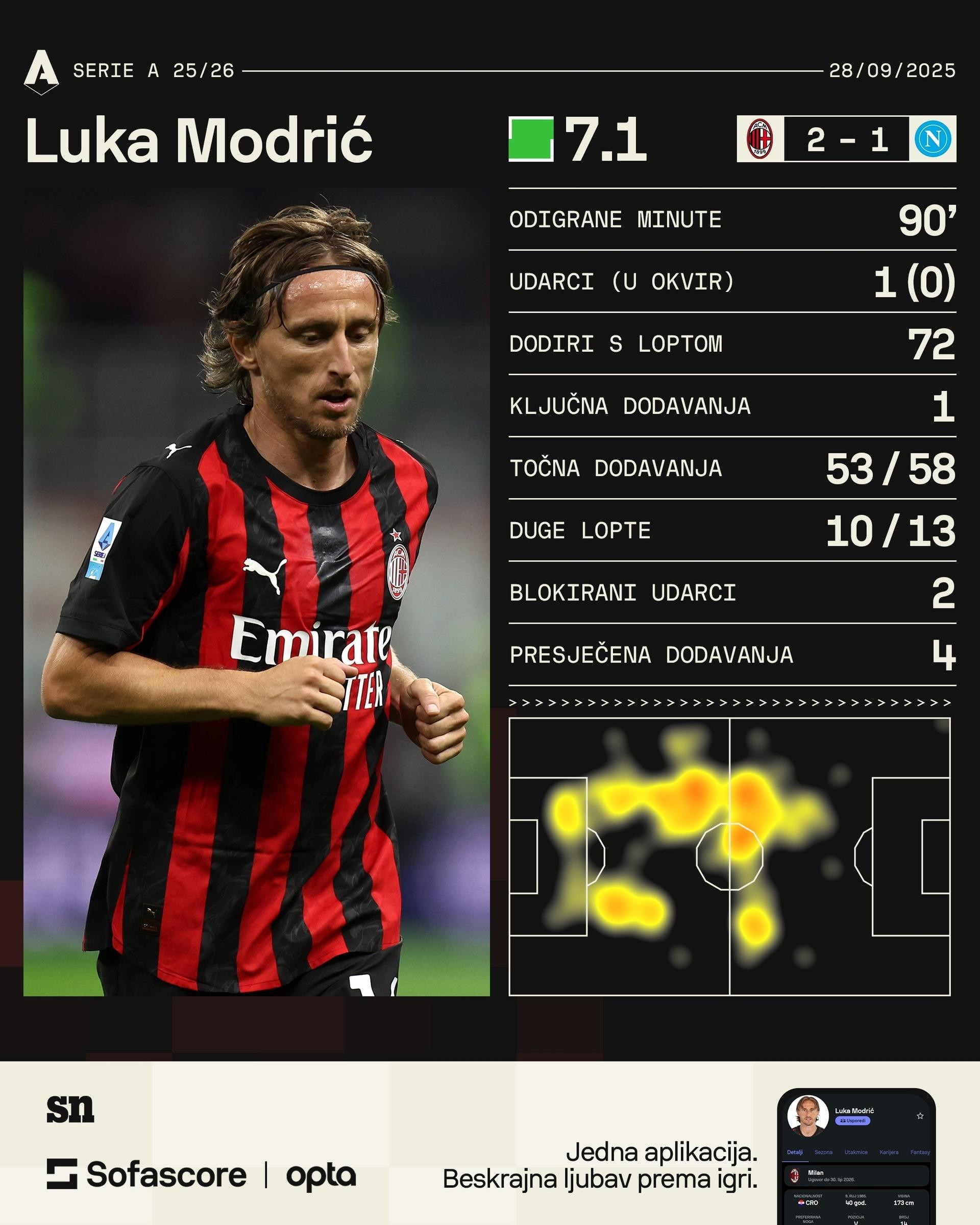 Modrić je poslao 53 (od 56) dodavanja u prave noge, čak 10 od 13 dugih lopi odsjelo je na željenoj adresi, presjekao je i četiri dodavanja... Dva puta pokušao je zaprijetiti s distance, no udarci su završili u bloku. Prezentacija i pobjeda Milana na koncu je bila dovoljna za prvo mjesto ljestvice (12 bodova), koje dijele s Napolijem.
