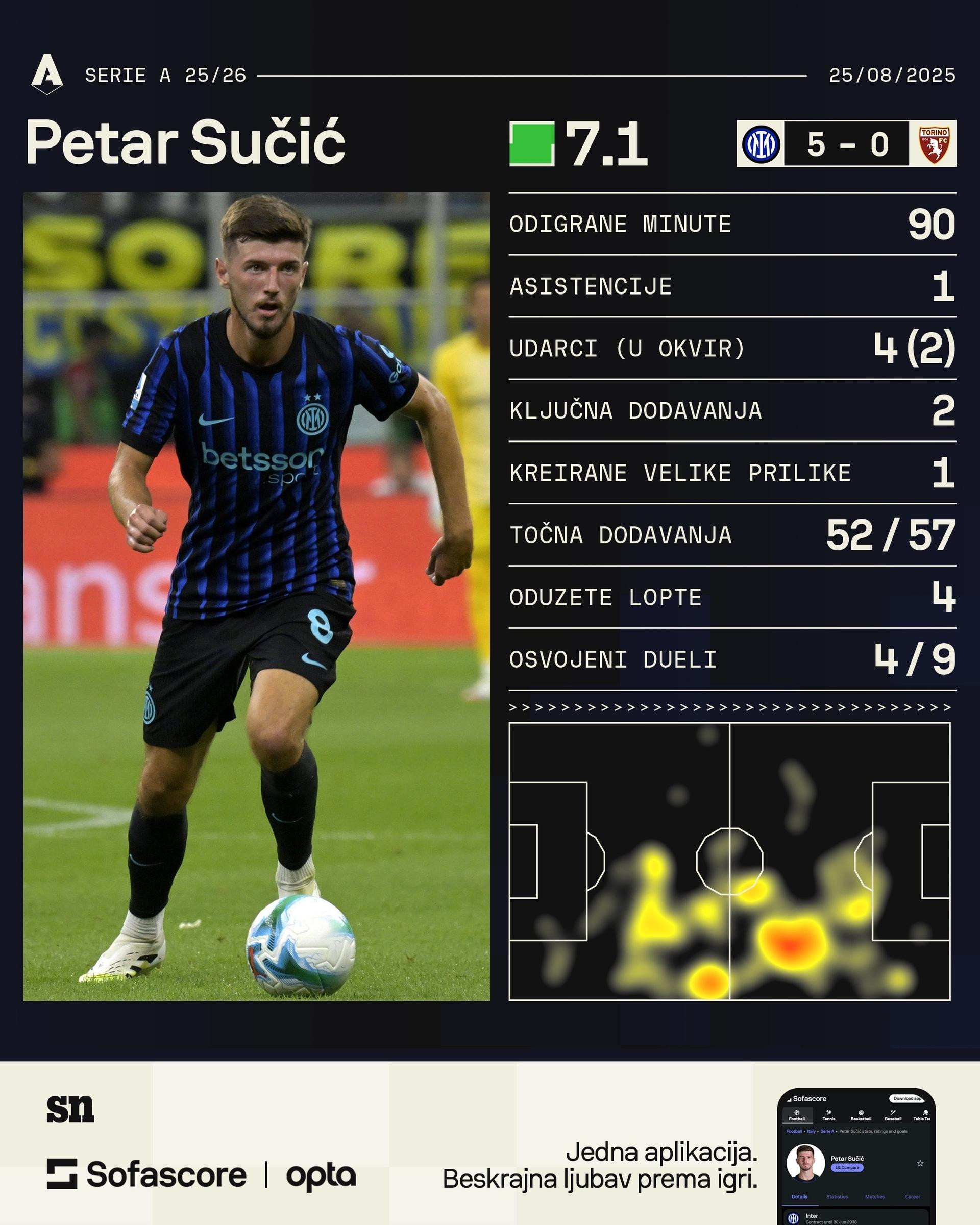 Inter je, dakle, "petardom" zagazio u novu talijansku utrku, a trener Christian Chivu podario čitavu utakmicu Petru Sučiću. Pored asistencije, Sučić je još četiri puta zapucao prema vratima, ostao praktički nepogrešiv u rubrici dodavanja (52/57), osvojio solidan broj duela (4/9) te pretrčao nešto više od 10 kilometara, više od svih Interovih igrača na travnjaku.