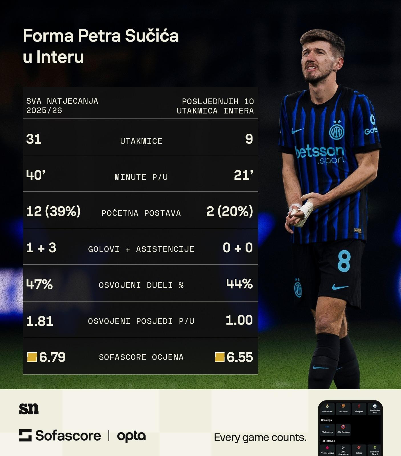 U deset odigranih utakmica od prve je minute započeo samo dvije (protiv Genoe i Parme), a u ostalima je minute dobivao ‘na kapaljku‘. U prosjeku je Sučić od početka prosinca za Inter igrao 21 minutu po susretu, a taj prosjek je, nažalost, dosta ‘napuhan‘ s dvije utakmice u kojima je igrao od prve minute. U jednoj utakmici nije dobio ni minute. Odjednom je Davide Frattesi (26), koji je cijele sezone malo igrao i bio na izlaznim vratima, postao četvrti veznjak u rotaciji i zauzeo mjesto ispred Vatrenog.