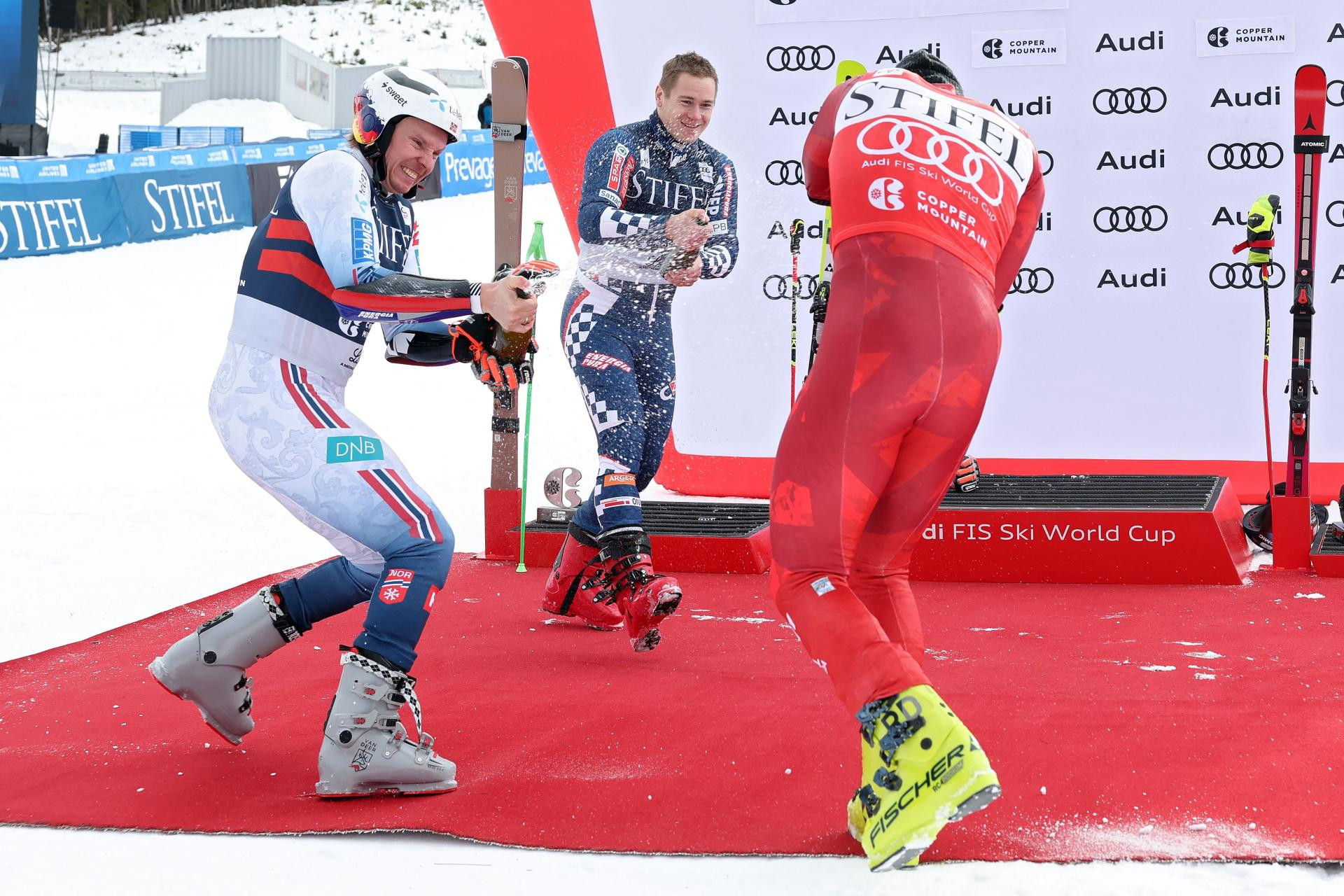 Zasluženi šampanjac - Henrik Kristoffersen, Filip Zubčić i Stefan Brennsteiner